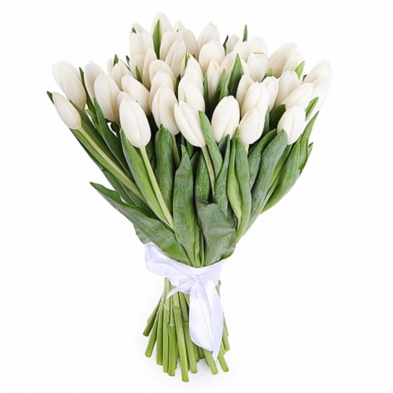 Букет состоит из 31 белый тюльпан, прозрачная упаковка, атласная лента.
