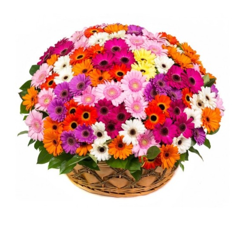 Букет состоит из MIX из 101 гербера, зелень, корзина.