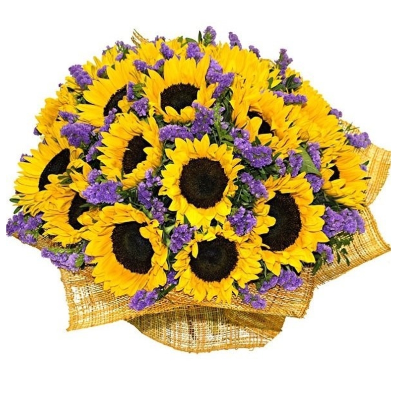 Букет состоит из 25 подсолнухов, 10 веток статицы, зелень, красивая упаковка, атласная лента.