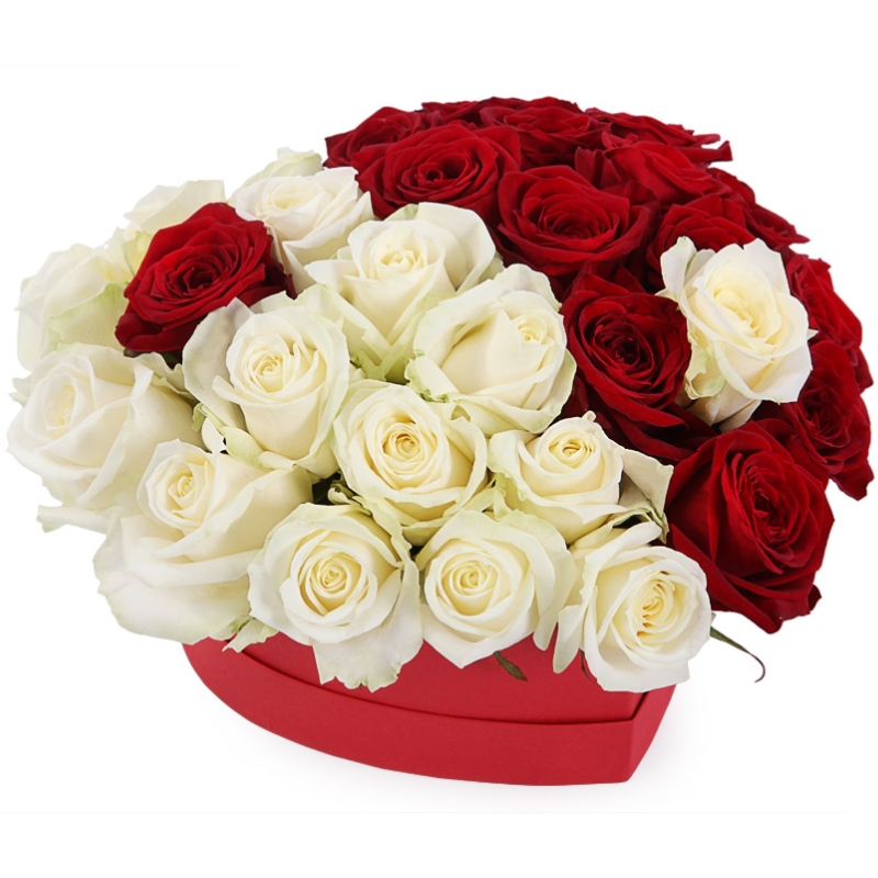 31 красная и белая роза, коробка в виде сердца.