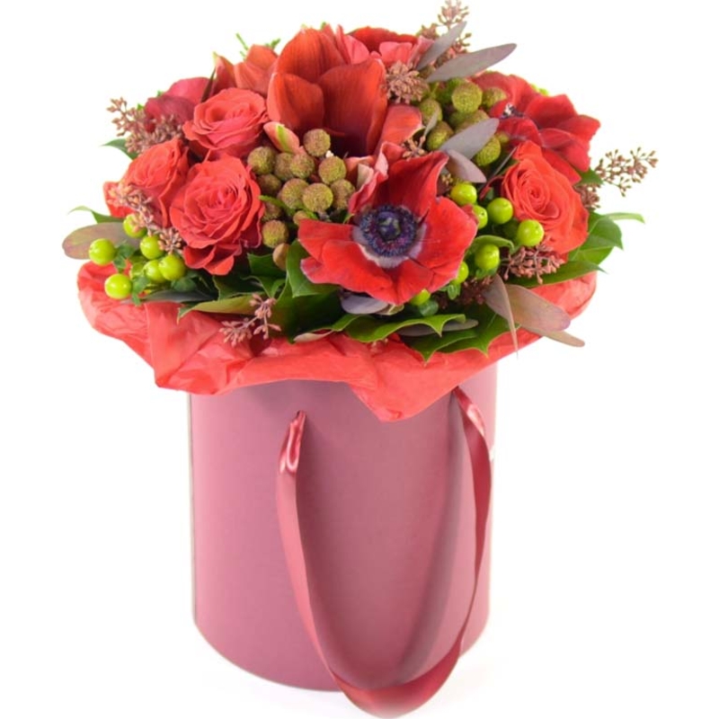 Букет состоит из 5 роз, 5 анемонов, 4 гиперикума, 1 амариллис, декоративная зелень, коробка, оазис.